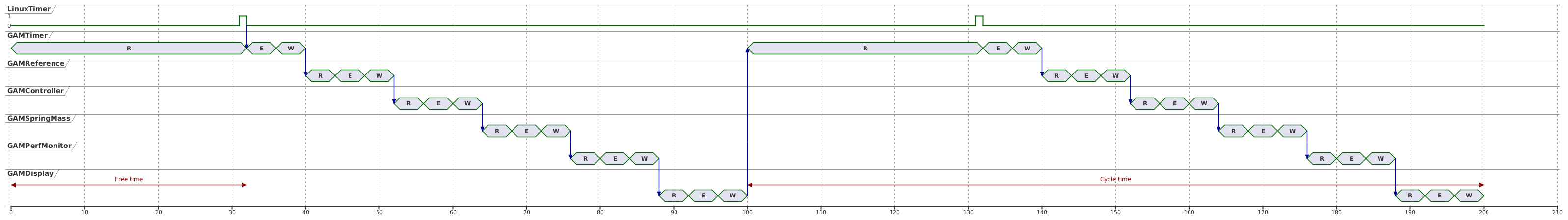 Since the measurements are taken during the cycle, the execution order of the GAM that reads from the Timing DataSource determines whether the reported times for other GAMs correspond to the current or the previous cycle. If the Timing GAM executes before the others, the reported times will refer to the previous cycle, but will remain consistent across all GAMs.